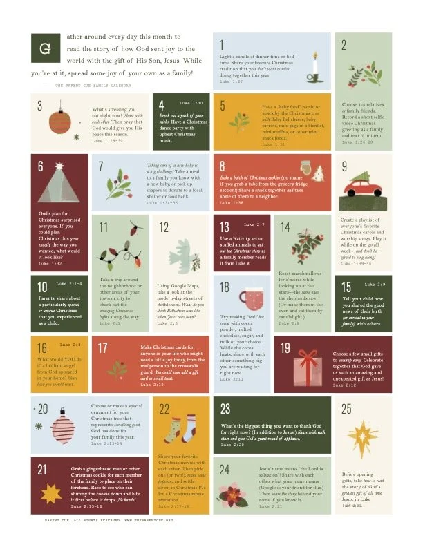 The days leading up to Christmas, the day we celebrate Jesus coming to us as a baby, can bring meaningful conversations and fun traditions. Choose an option or two below to help you have fun and bring meaning to the days leading up to Christmas.